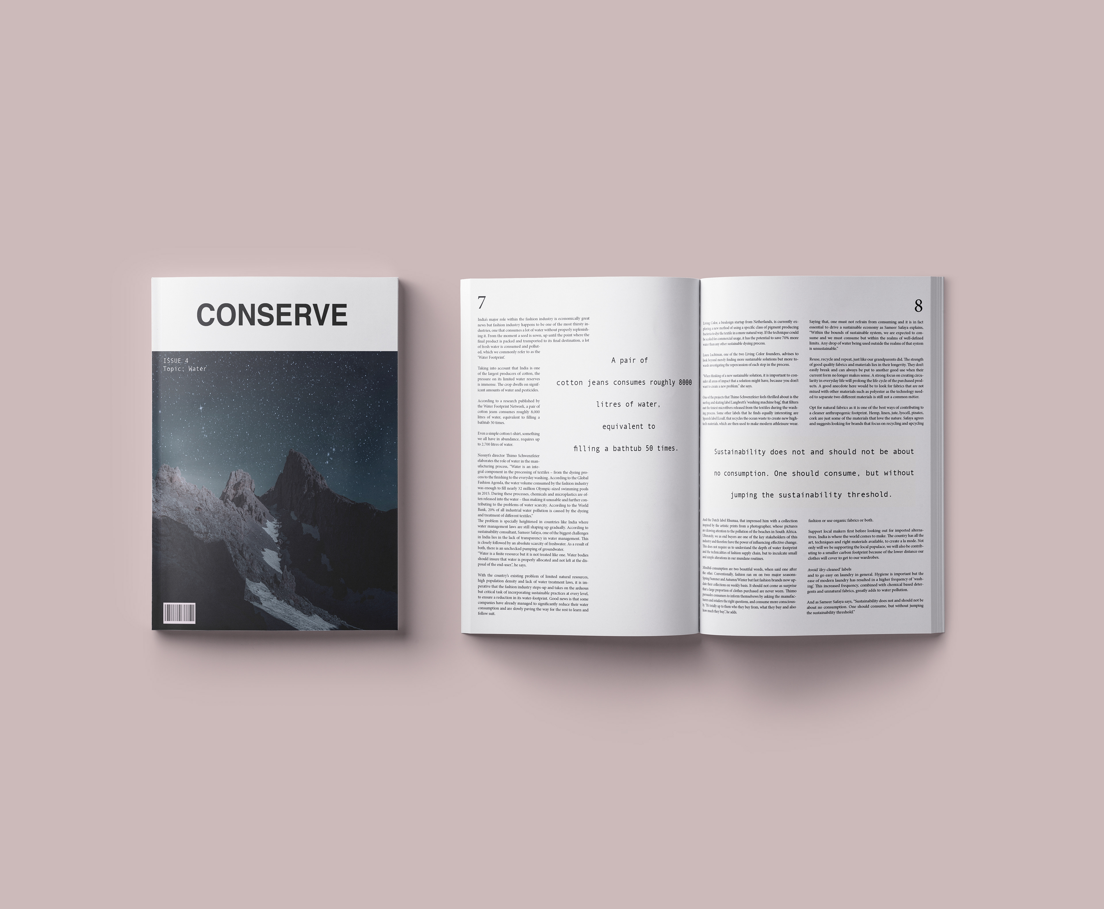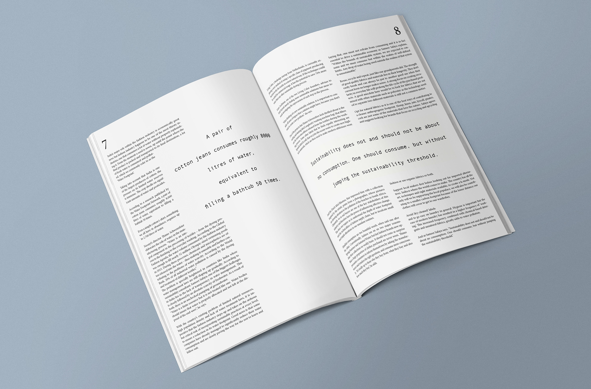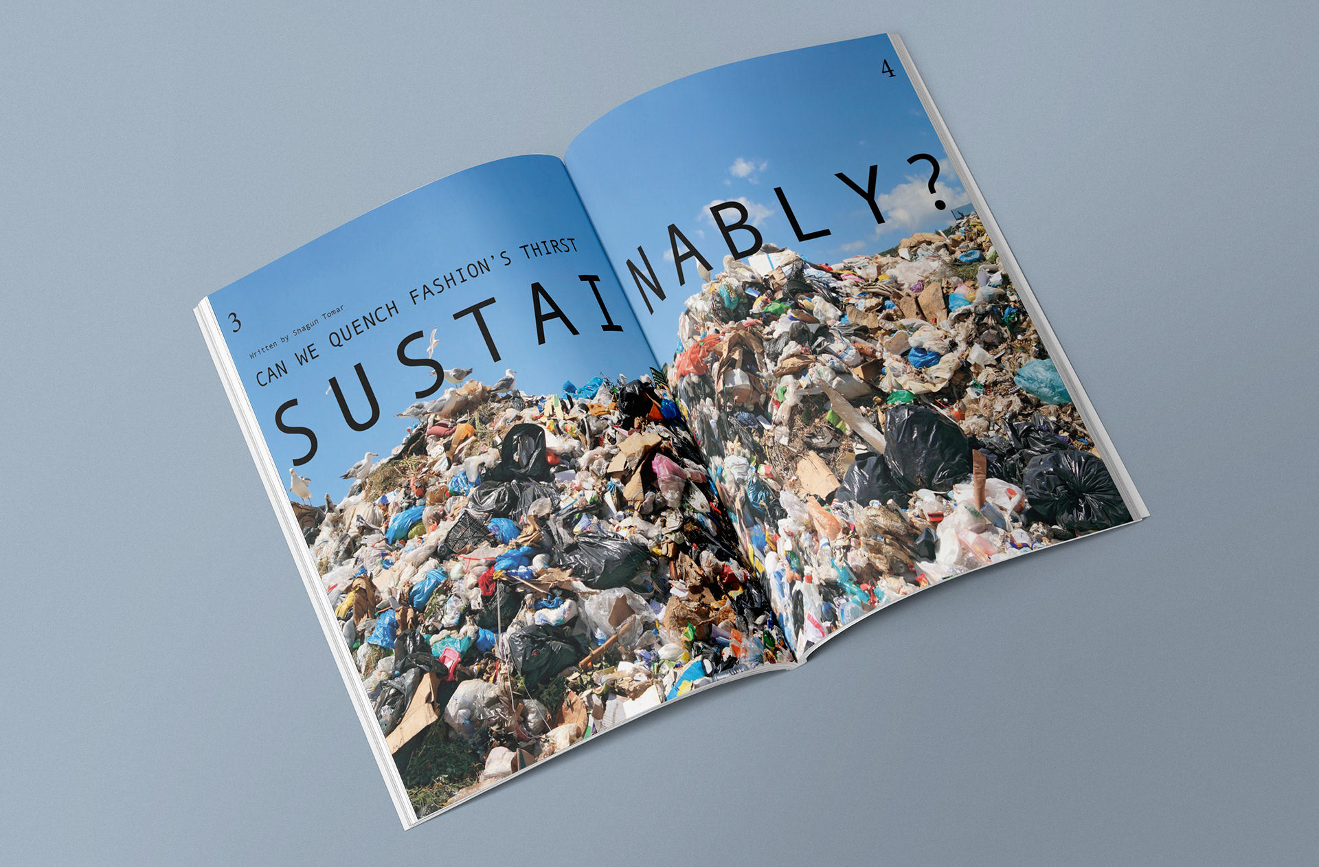 Editorial layout for a magazine based on environment and sustainability. Minimalist layout that plays with type to create textures and layers.